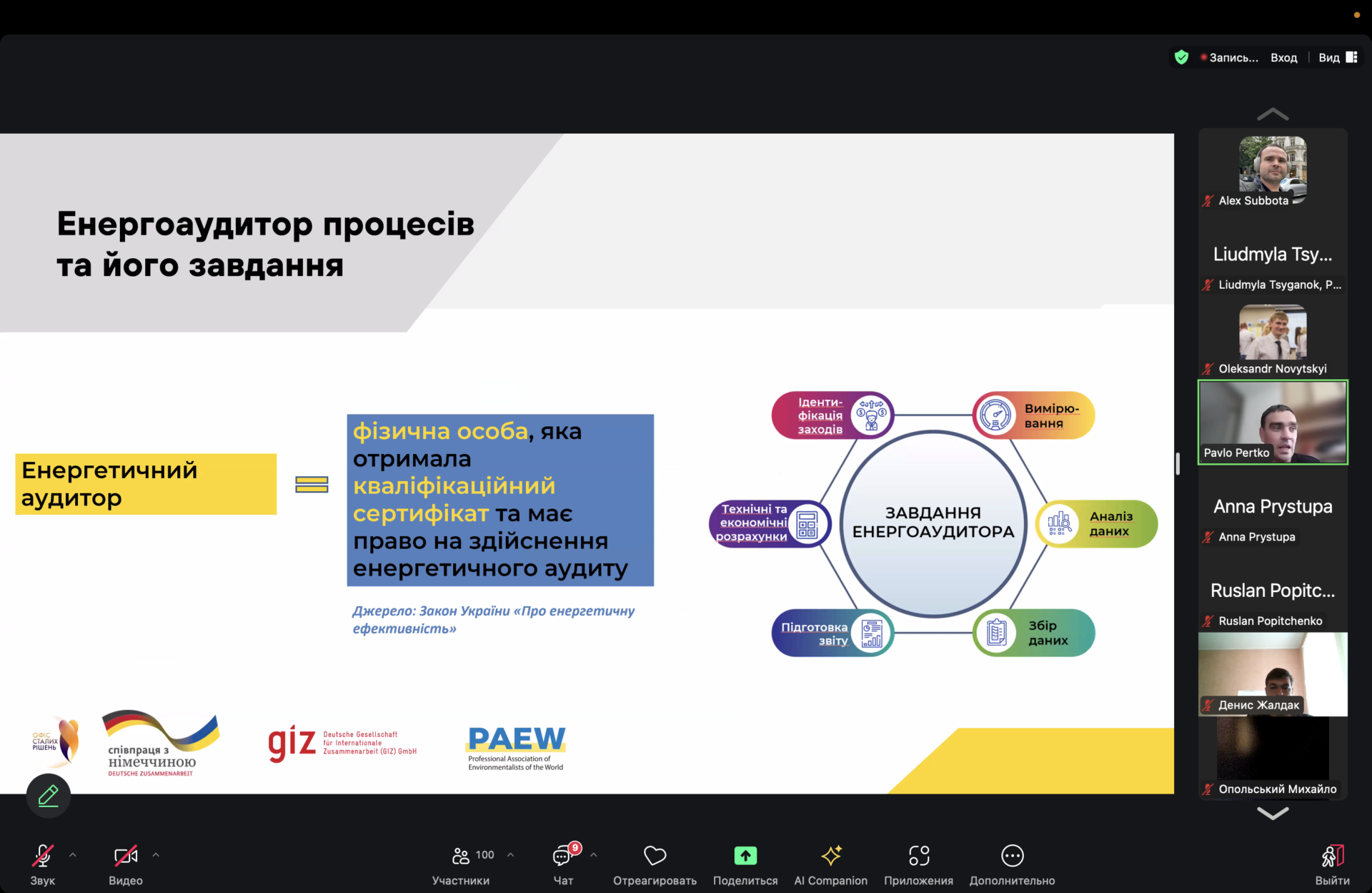 Для понад 120 учасників в прямому ефірі експерти розкривали питання «Як відбувається планування процесу проведення енергоаудитів та оцінок для визначення можливостей енергозбереження на промислових підприємствах», ще понад 200 тих, хто зареєструвався та не зміг підключитись через відсутність звʼязку пройдуть цей модуль дистанційно.