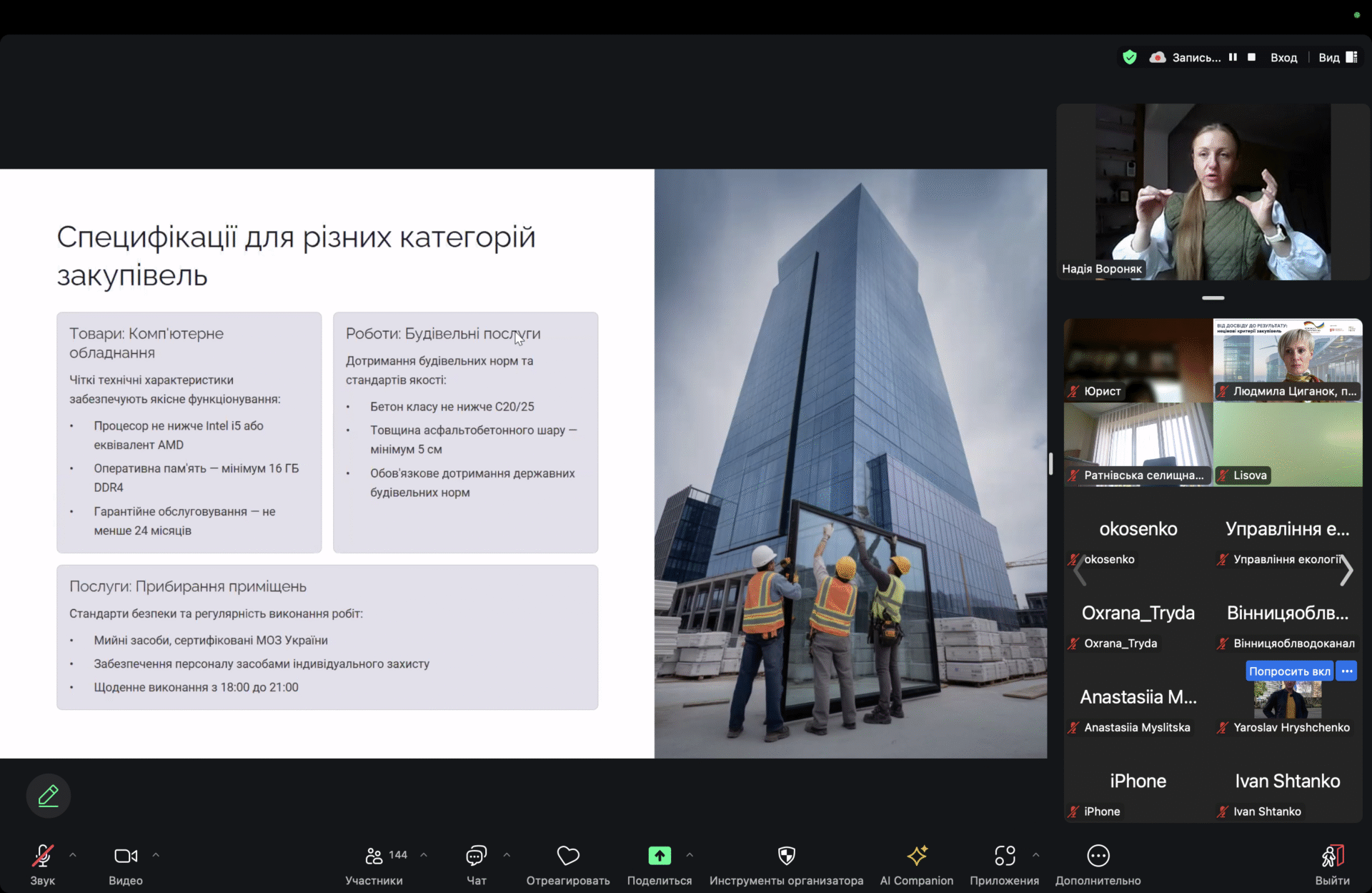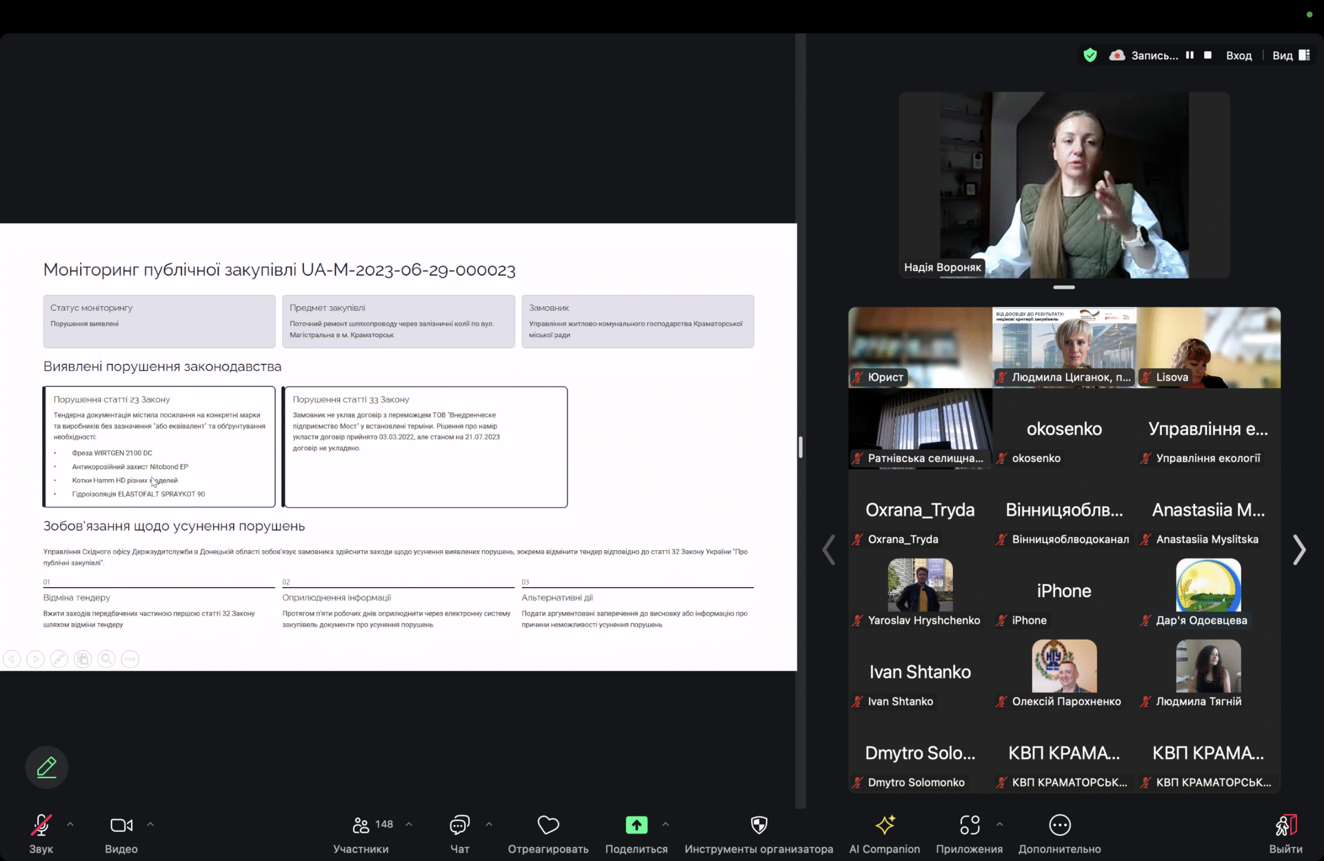НАДІЯ ВОРОНЯК, фахівчиня з публічних закупівель з багаторічним досвідом практичної роботи у сфері закупівель як зі сторони державного замовника, так і учасника презентувала матеріали навчального модулю за блоками: