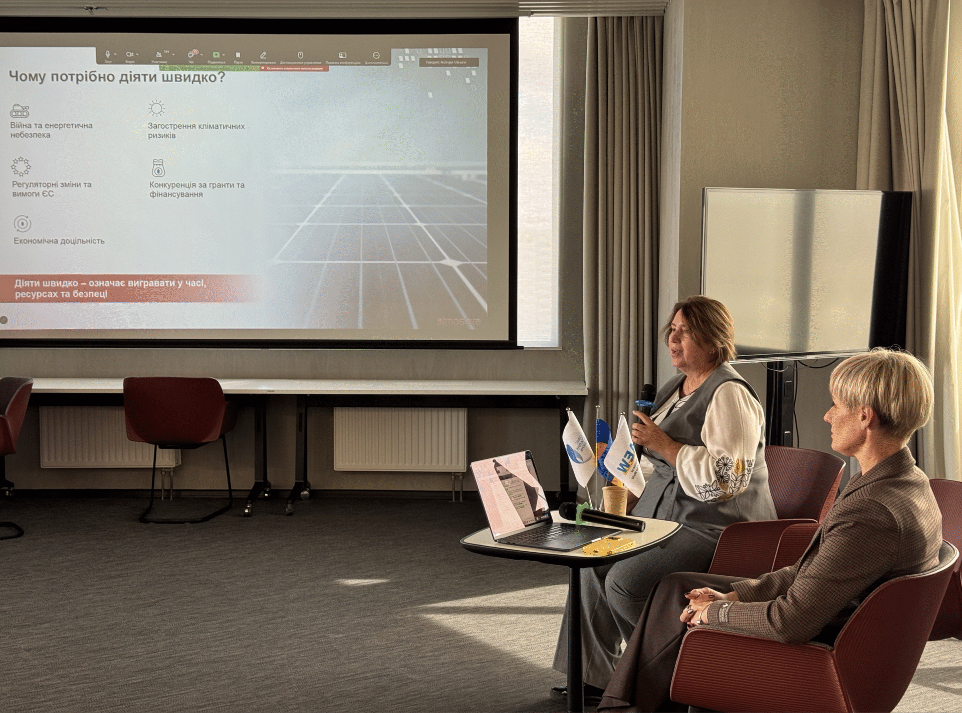 Тетяна Нехайчук, керівниця проєктного офісу Всеукраїнської асоціації об’єднаних територіальних громад, директорка консалтингової компанії «Бустерс консалтинг груп», експертка з євроінтеграційних процесів, підкреслила, що варто діяти невідкладно, адже війна підсилює кліматичні ризики: посухи, паводки, екстремальні температури; євроінтеграційні стандарти та Зелений курс ЄС роблять адаптацію і декарбонізацію обов’язковими для місцевих стратегій, а кліматична стійкість вже є одним із критеріїв доступу до фінансування та партнерств.