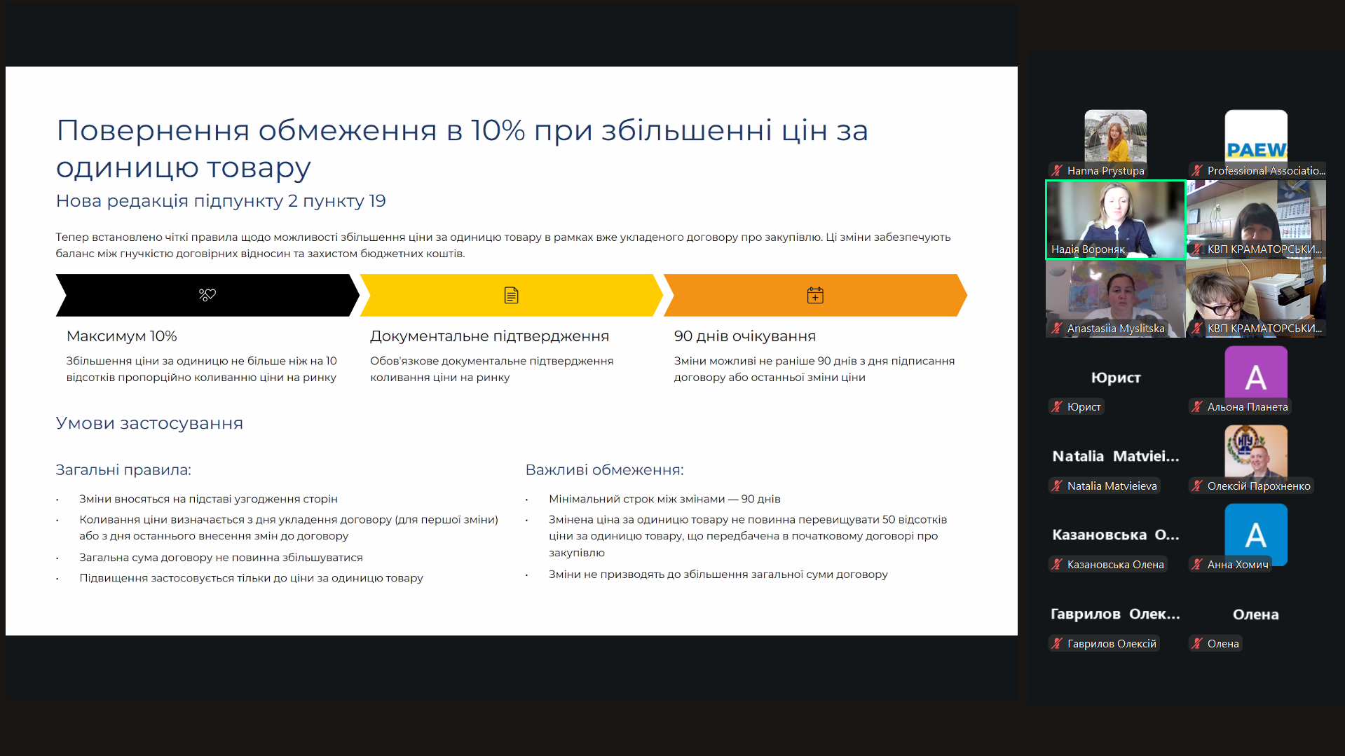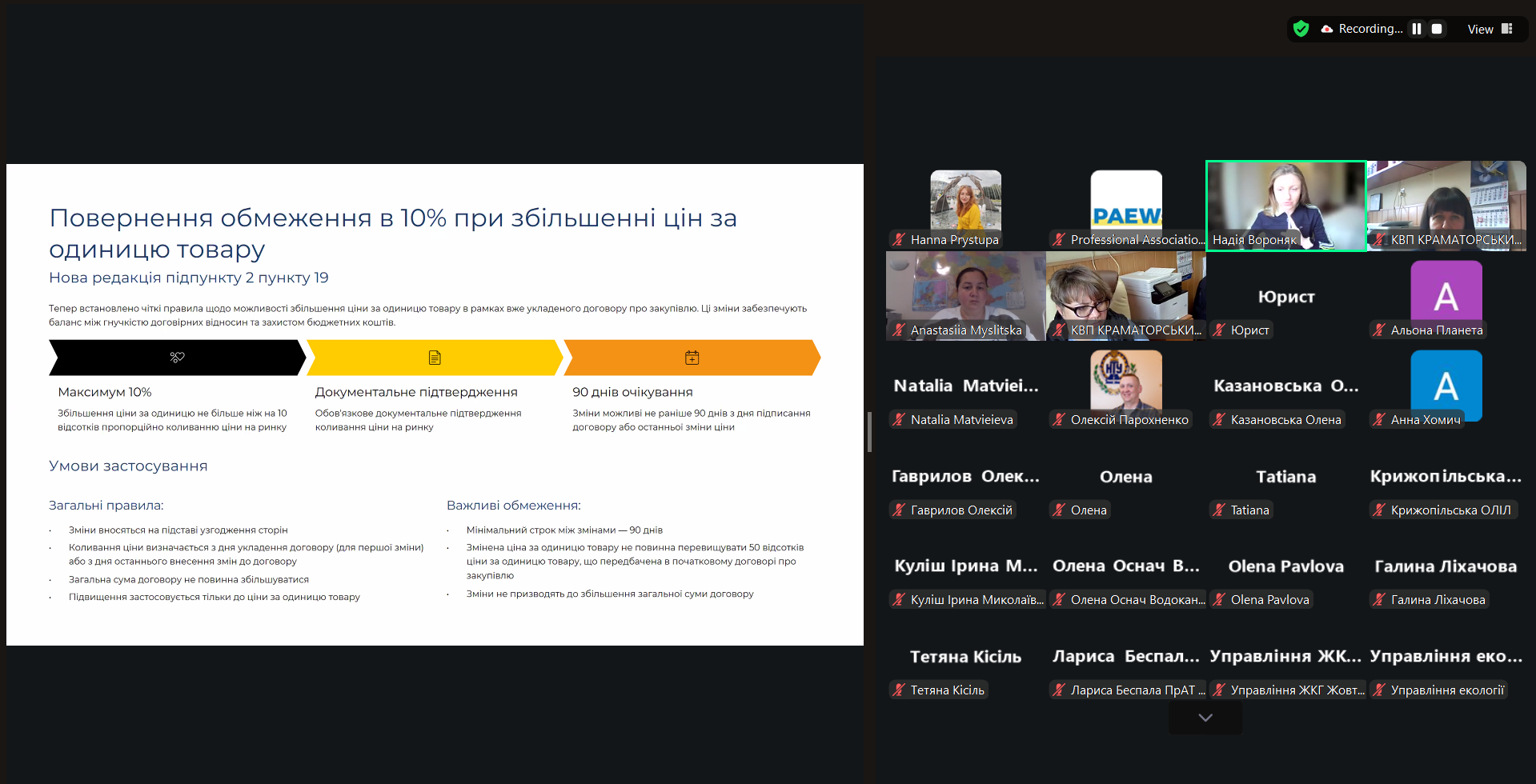 У прямому ефірі до навчання долучилися понад 140 учасників – представники комунальних установ, органів влади та бізнесу. Темою завершального заняття стали «Зміни в Prozorro: нові можливості для комунальних установ».