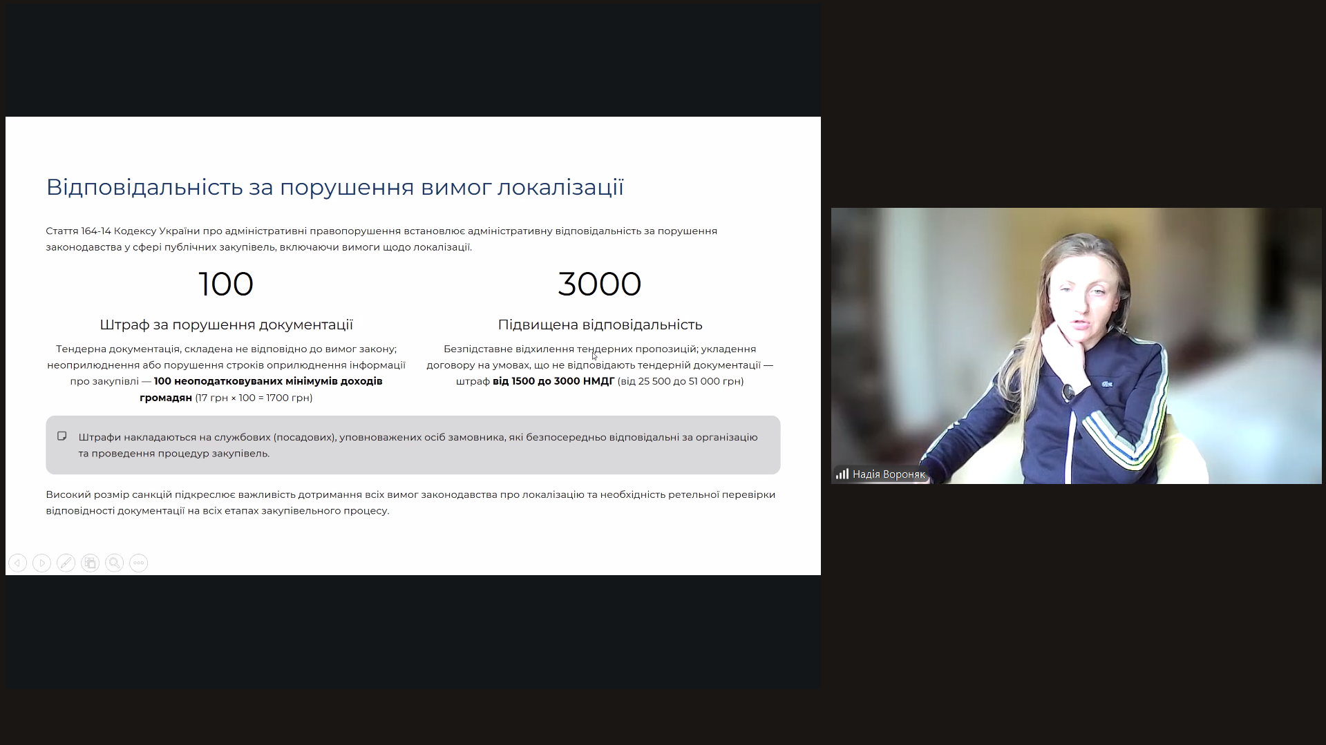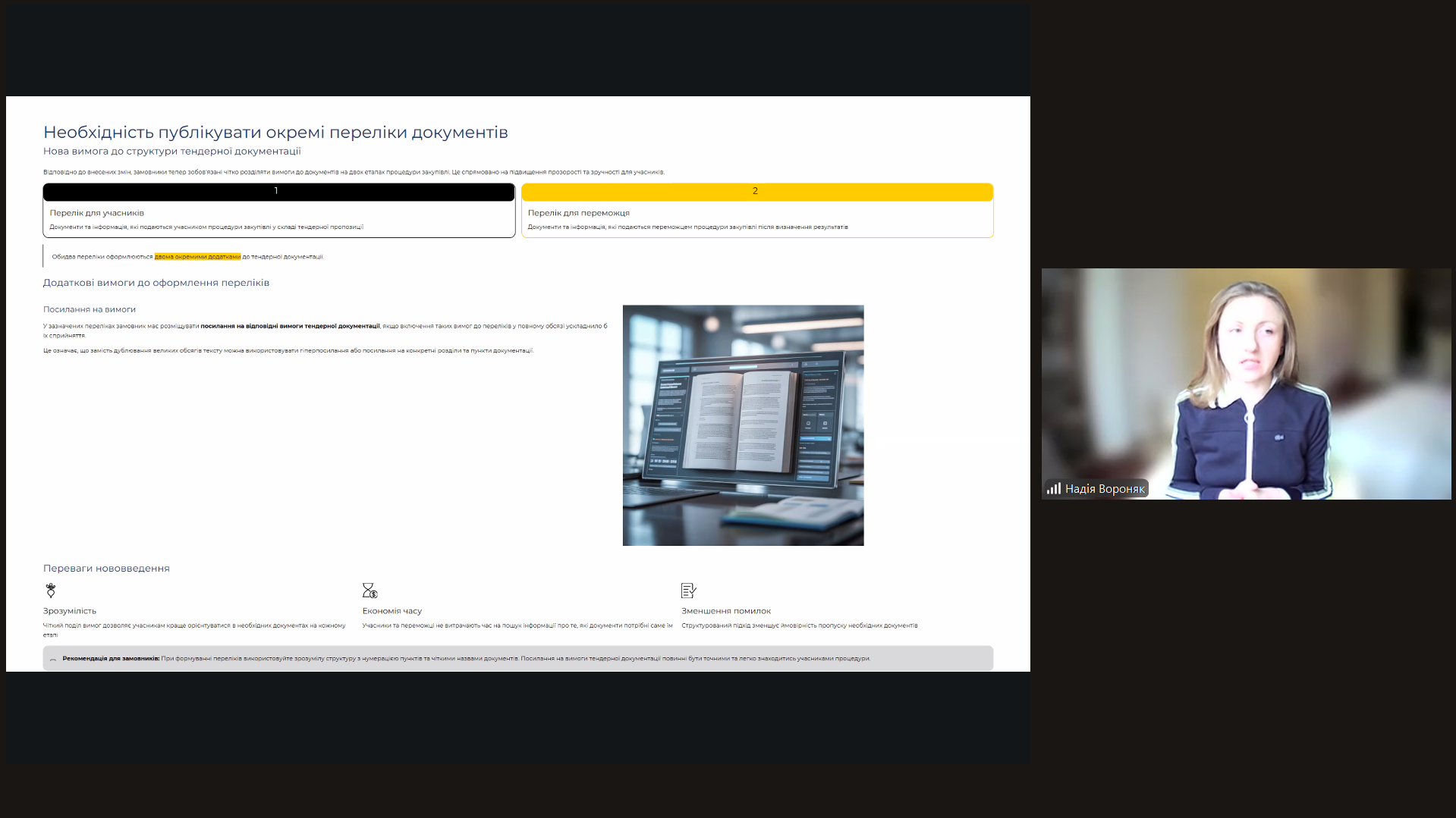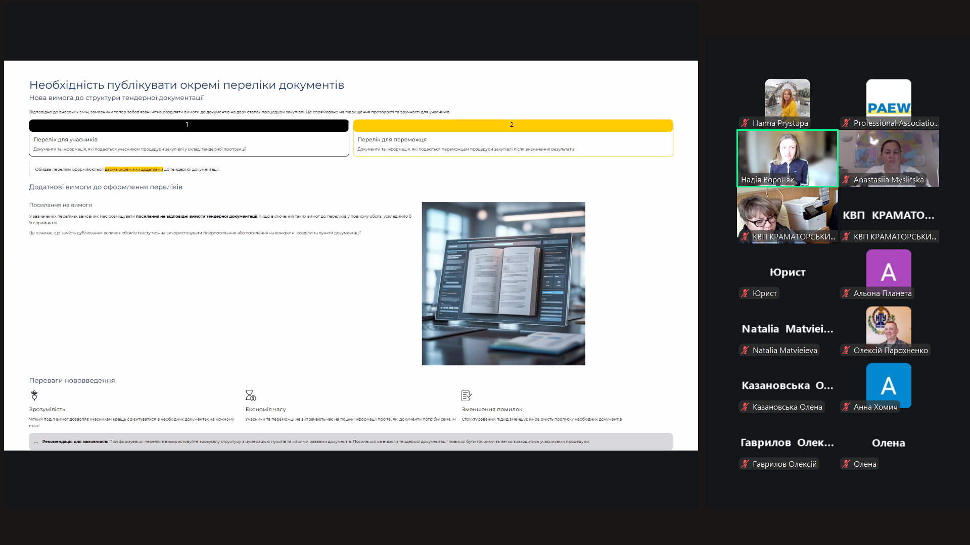 Спікерка модуля – Надія Вороняк, фахівчиня з публічних закупівель із багаторічним досвідом як з боку державного замовника, так і постачальника, представила практичні інструменти та ключові оновлення системи Prozorro: